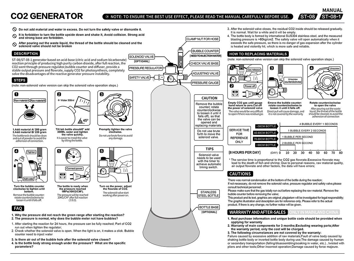 Generatorul de CO2 pentru acvariu ST-08-1 utilizează principiul unei reacții acido-bazice, reacționând acidul citric cu bicarbonatul de sodiu pentru a produce CO2 de înaltă puritate. Printr-o formulă formulată științific și un proces de reacție eficient, dispozitivul eliberează constant CO2, oferind o aprovizionare continuă cu gaz plantelor de acvariu, satisfacând nevoile lor de fotosinteză și promovând o creștere sănătoasă. În comparație cu generatoarele tradiționale de tip reacție, ST-08-1 are un control îmbunătățit al presiunii. Echipat cu un regulator de presiune dedicat, contor de bule și difuzor, oferă o presiune de ieșire stabilă și o dispersie uniformă a bulelor, eliminând inconvenientele cauzate de fluctuațiile de presiune.
